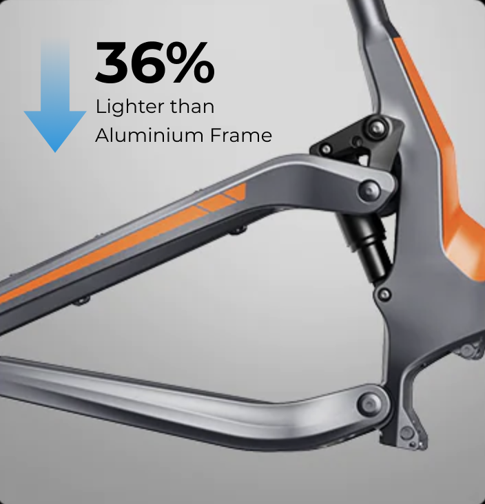 Crafted from T800 carbon fiber, HERO's mainframe is a marvel,fusing strength with featherweight design. Harnessing carbon fiber's advantages, it offers exceptional durability while shedding excess weight. Meticulously engineered to diminish wind resistance and absorb vibrations, it guarantees a smoother, more comfortable ride. Providing precise control and effortless pedaling on challenging terrains, this frame embodies enduring durability, agile performance, and exceptional quality.
