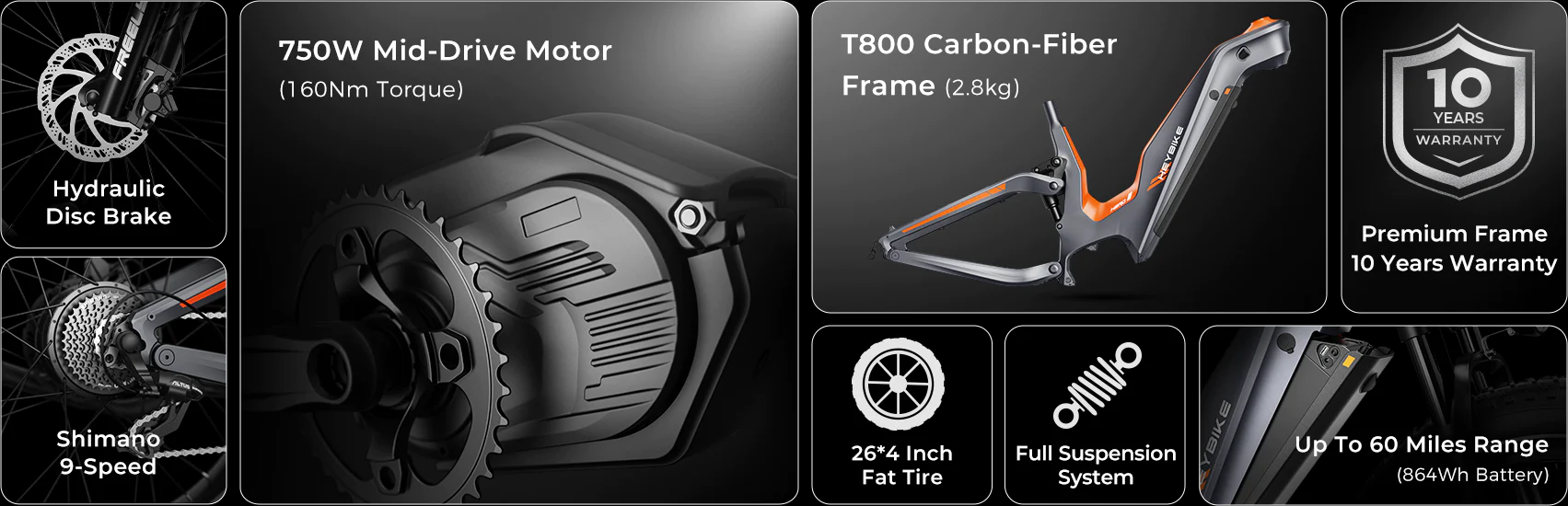 HERO's T800 carbon fiber mainframe ensures exceptional durability and reduced weight, minimizing wind resistance and absorbing vibrations for a smoother, more comfortable ride. Weighing just 2.8kg, it's 36% lighter than aluminum.